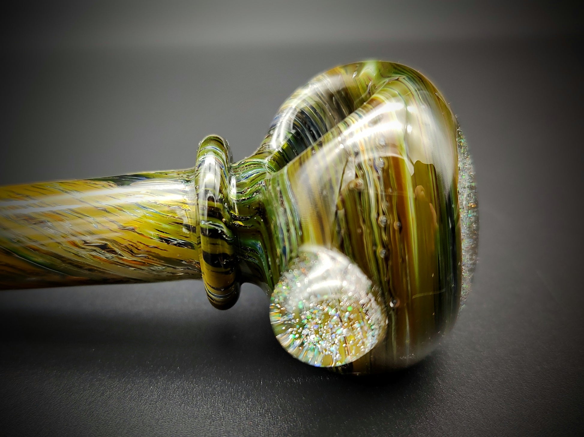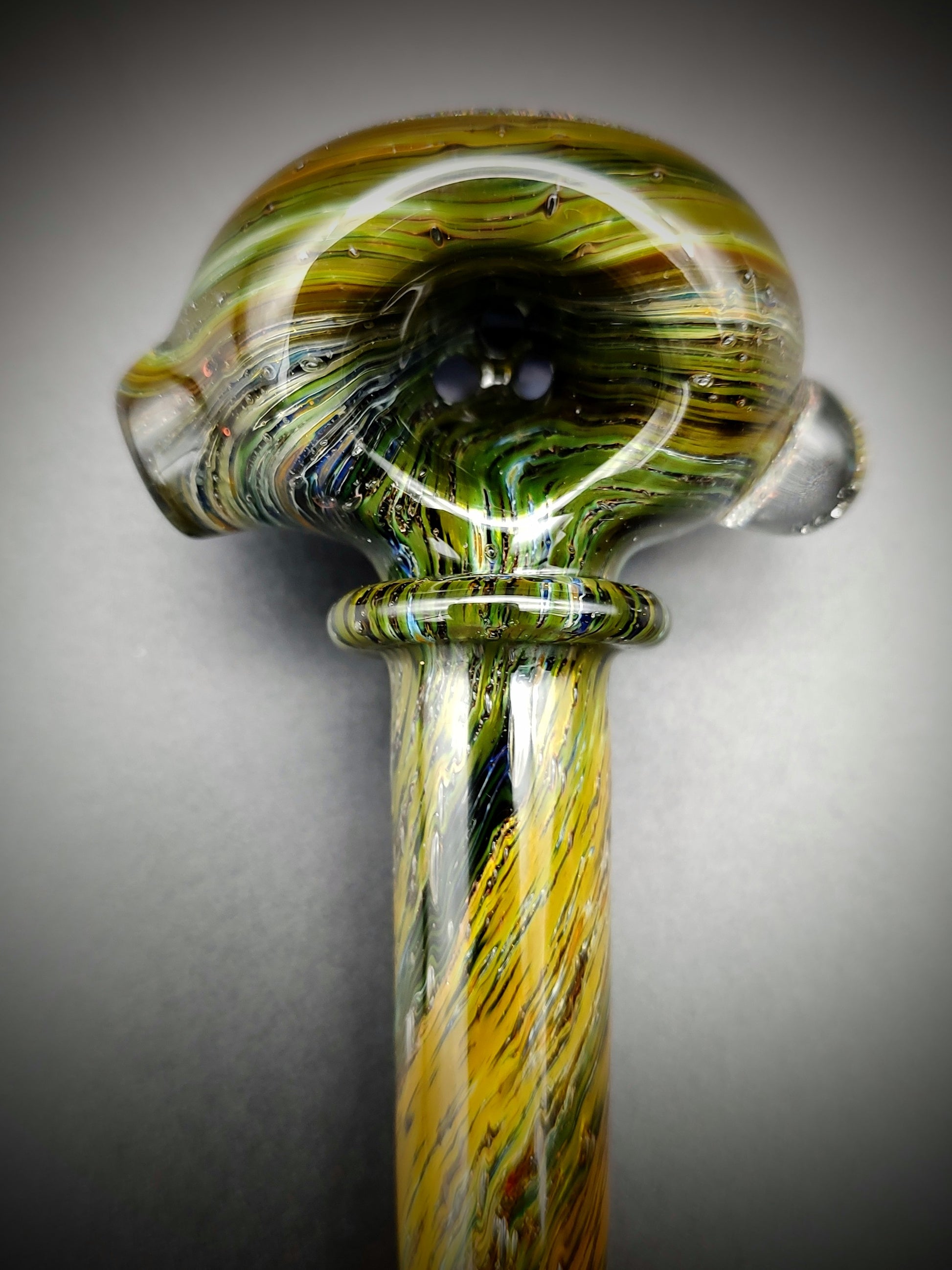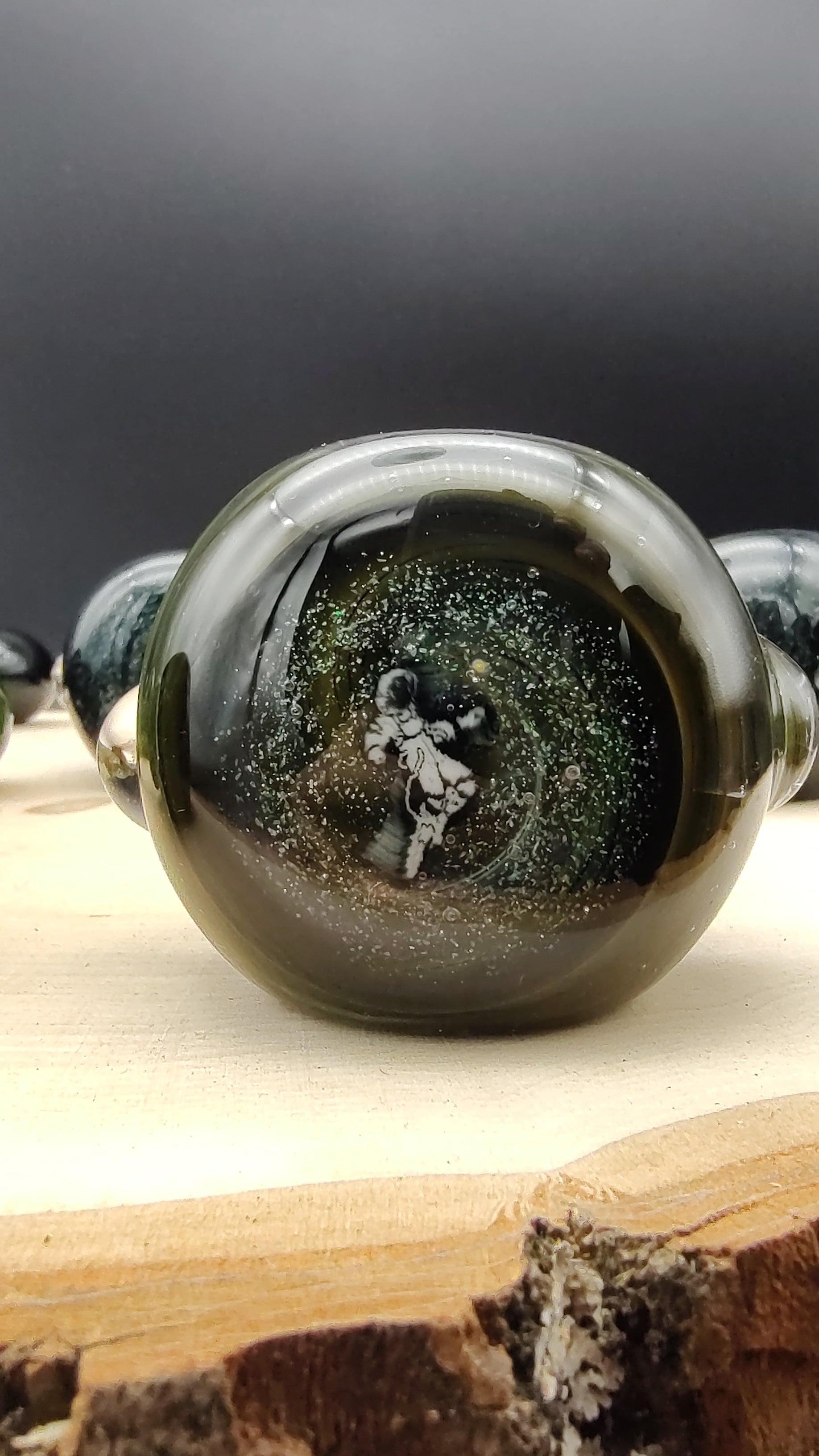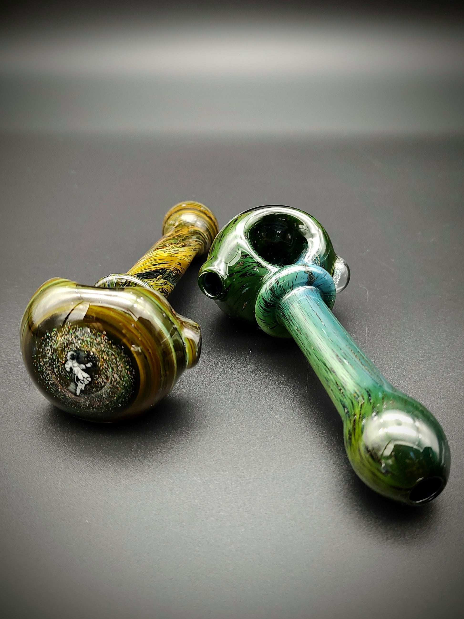 Estas pipas están hechas con virutas de oro y plata sobre tubos de color y revestidas de transparente para darle ese aspecto "espacial". La tapa del extremo tiene un ópalo triturado con una imagen de un astronauta. Todas las pipas están fabricadas con un recipiente de 3 orificios que sirve como una pantalla de vidrio incorporada, lo que ayuda a reducir la succión accidental de cualquier material no fumado.