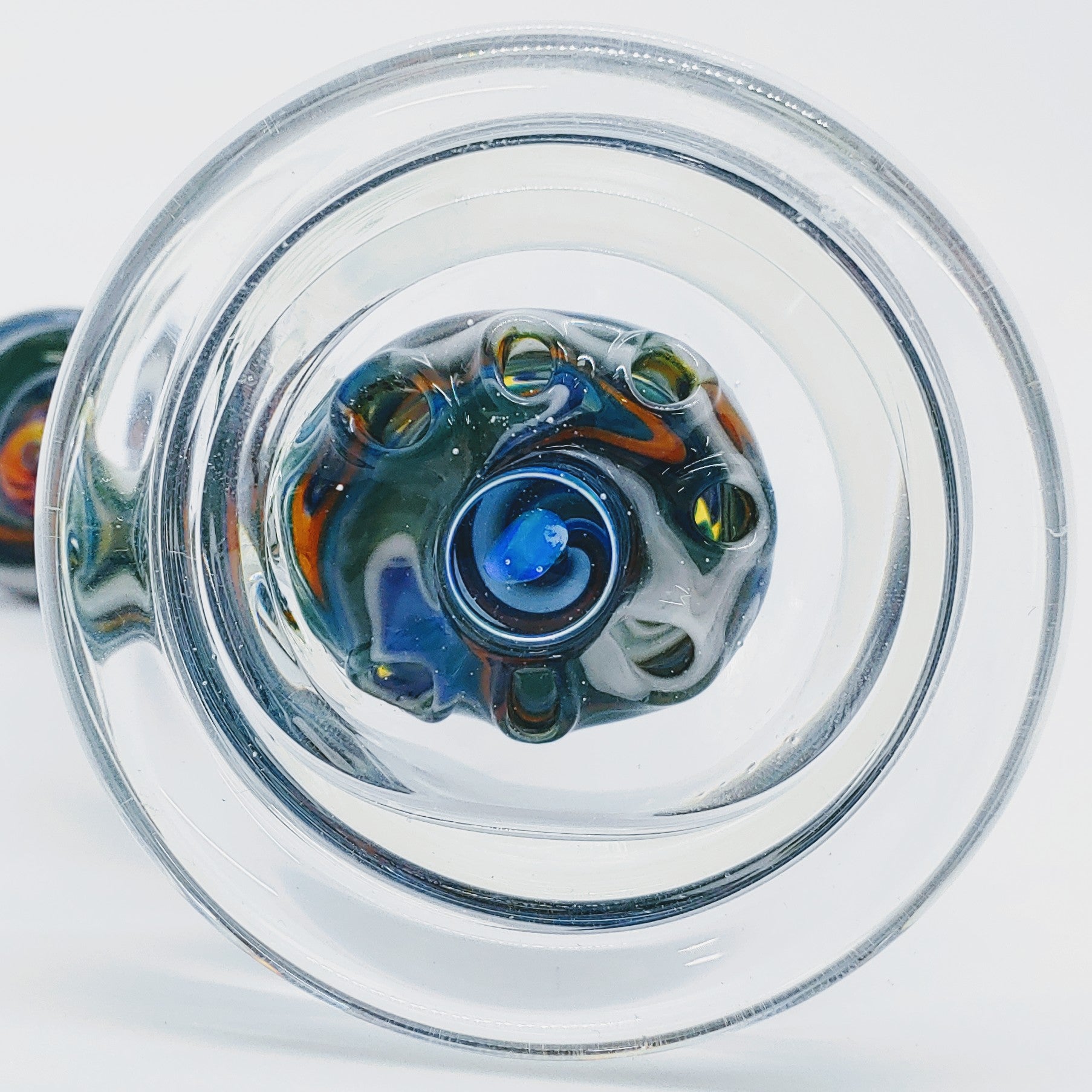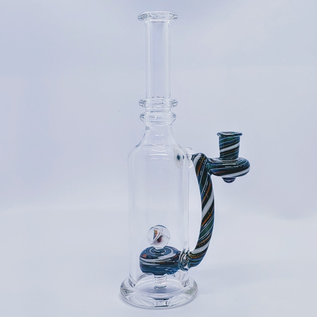 Cuerpo transparente de 9" con línea trabajada desde el vástago hasta el disco hueco; adornado con mármol multi-murrini y accesorio mili; conector hembra de 10 mm hecho a mano.