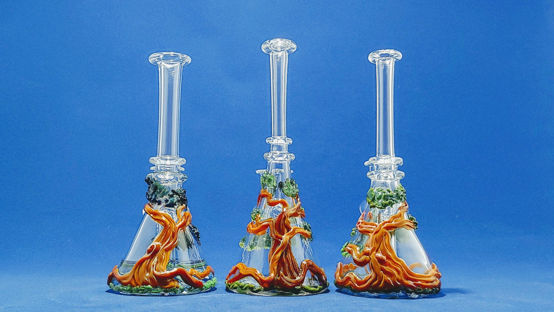 Árbol bonsái esculpido en un vaso de precipitados transparente con fondo azul en forma de remolino