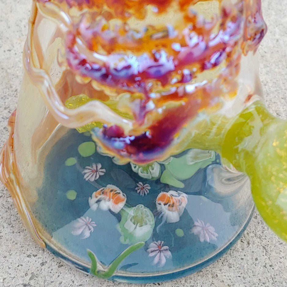 Plataforma dicro con un árbol colorido envuelto alrededor del exterior junto con un estanque koi que cubre el fondo