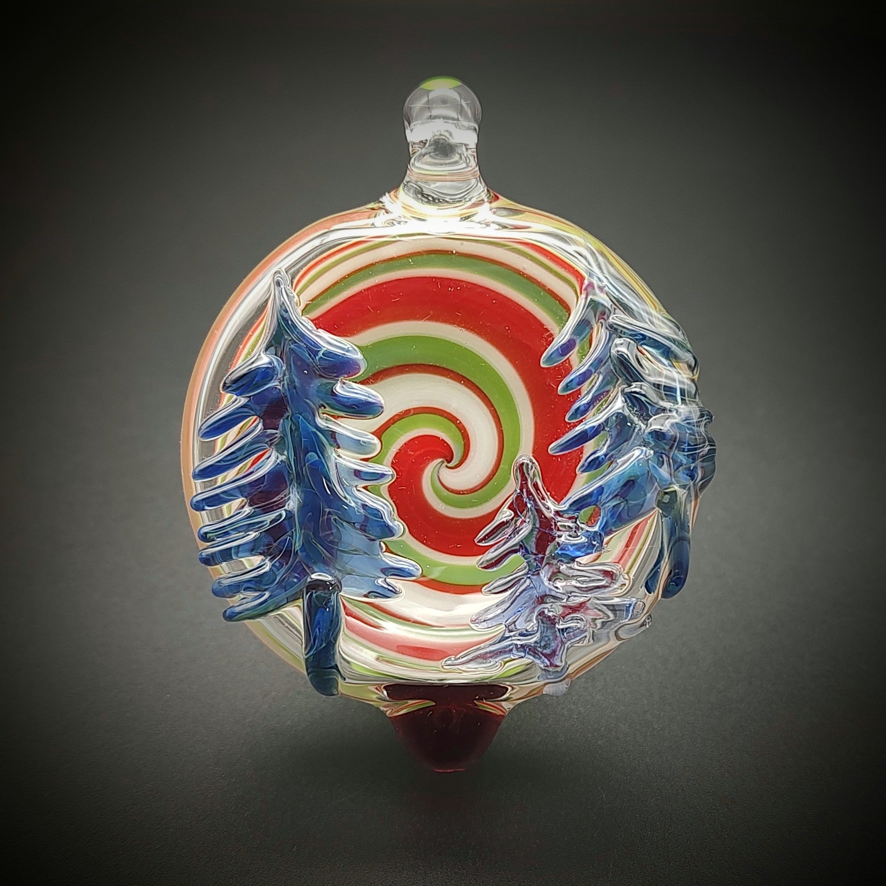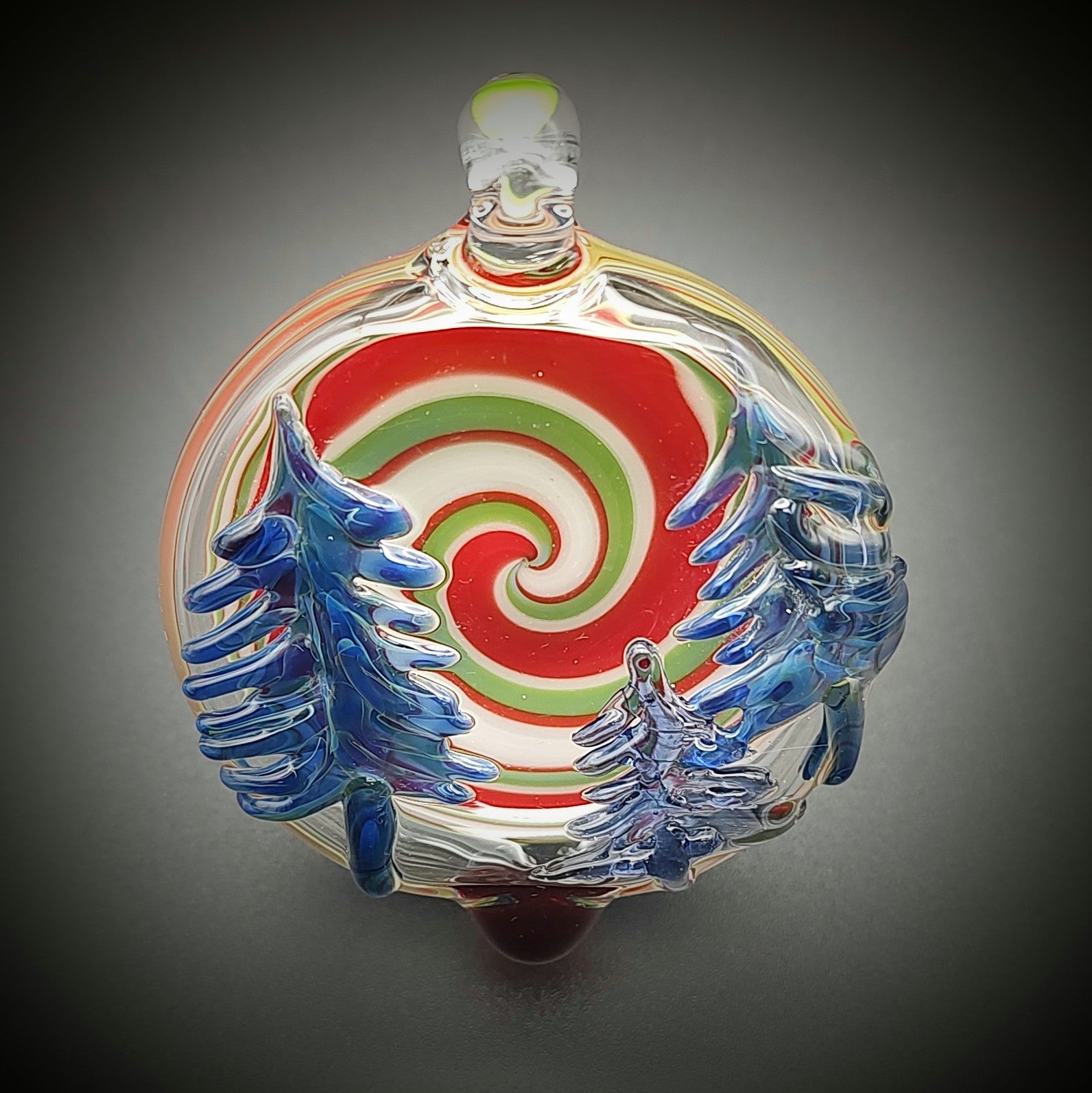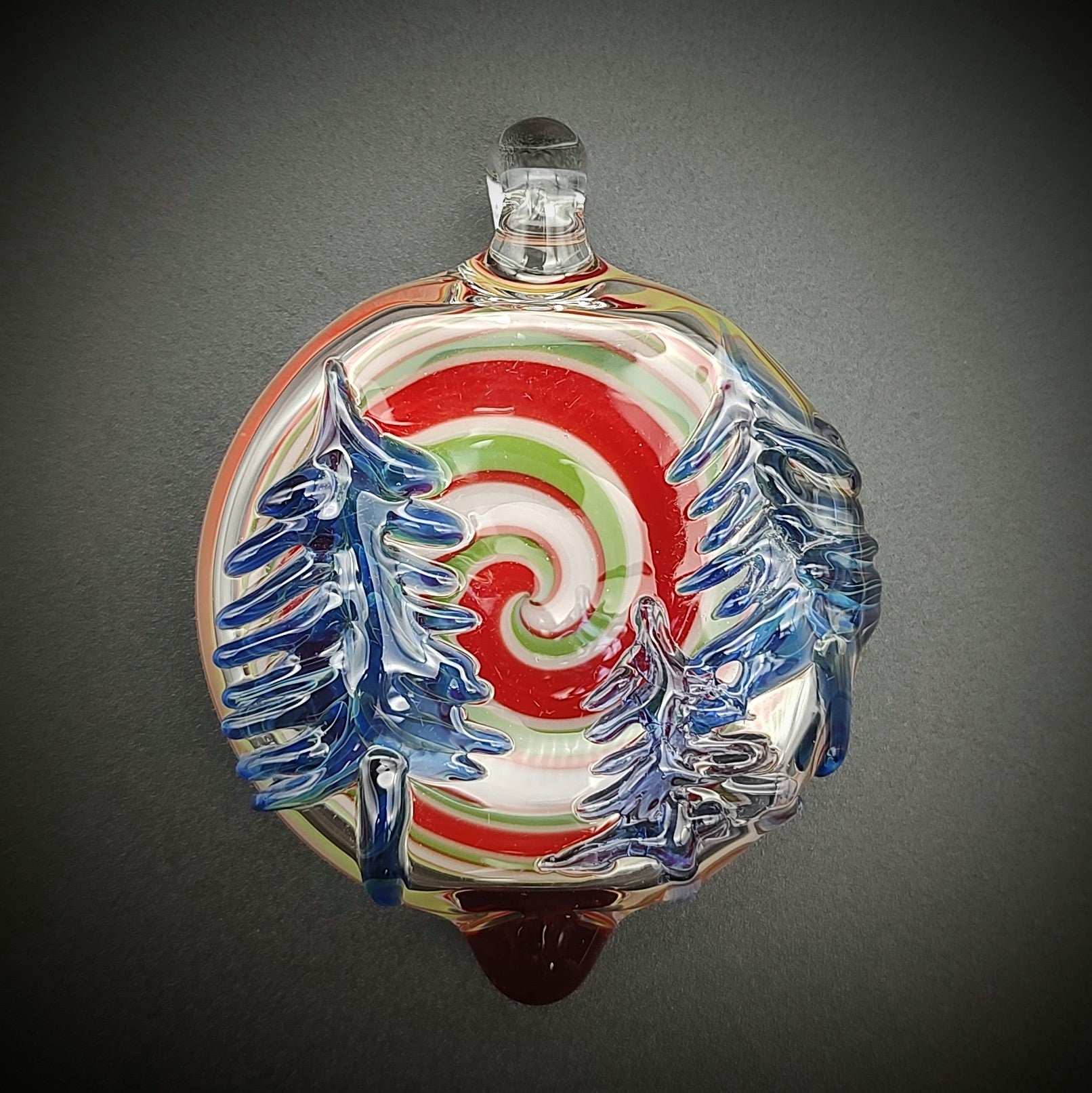 Este lujoso adorno navideño es el complemento festivo perfecto para tu decoración. Adornado con un patrón arremolinado de árboles azules sobre un fondo de espiral tradicional roja, verde y blanca, este llamativo adorno aportará espíritu y alegría a cualquier exhibición navideña. Con alrededor de 2" de diámetro, este adorno es un complemento elegante y atemporal para su hogar.
