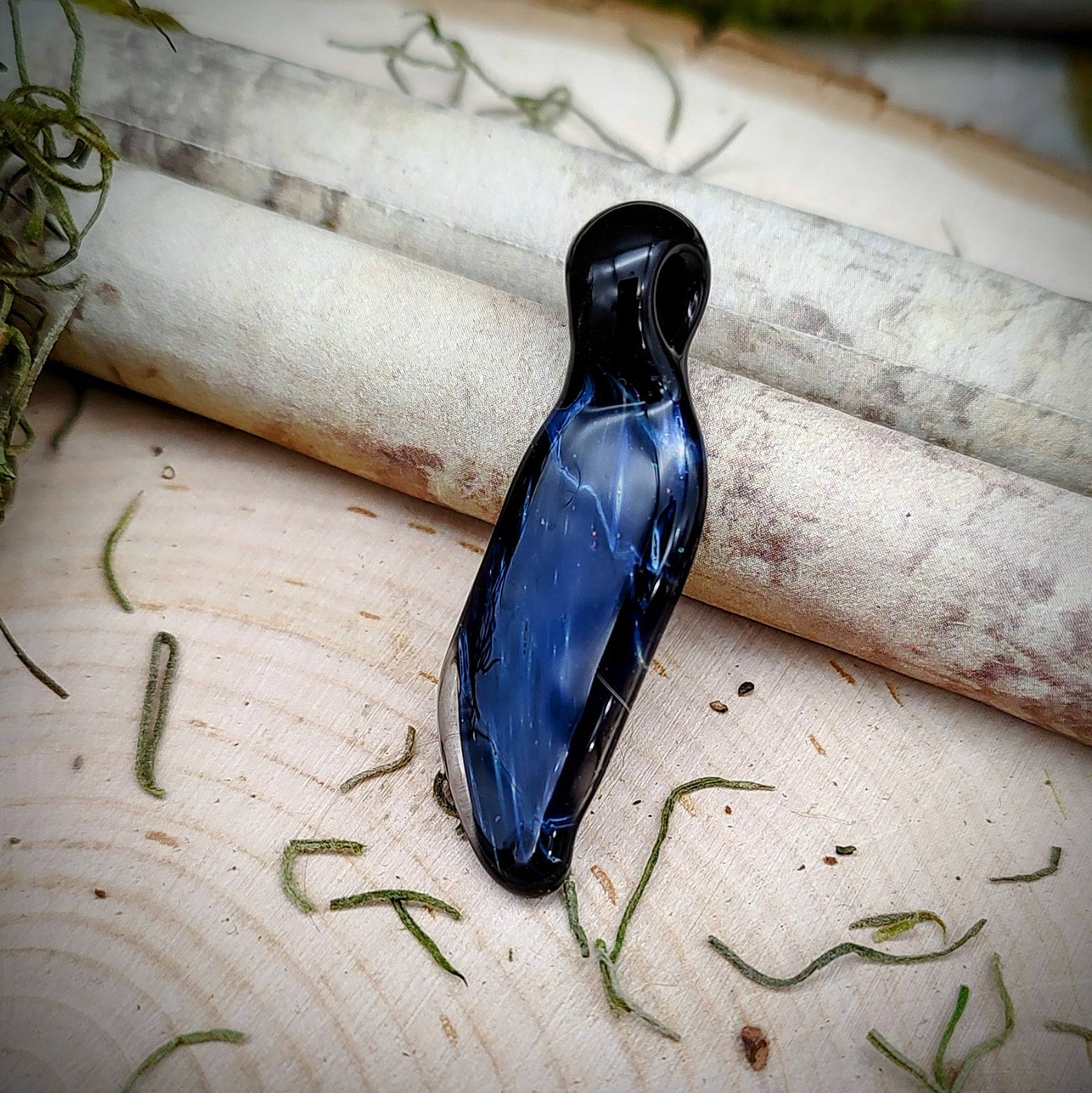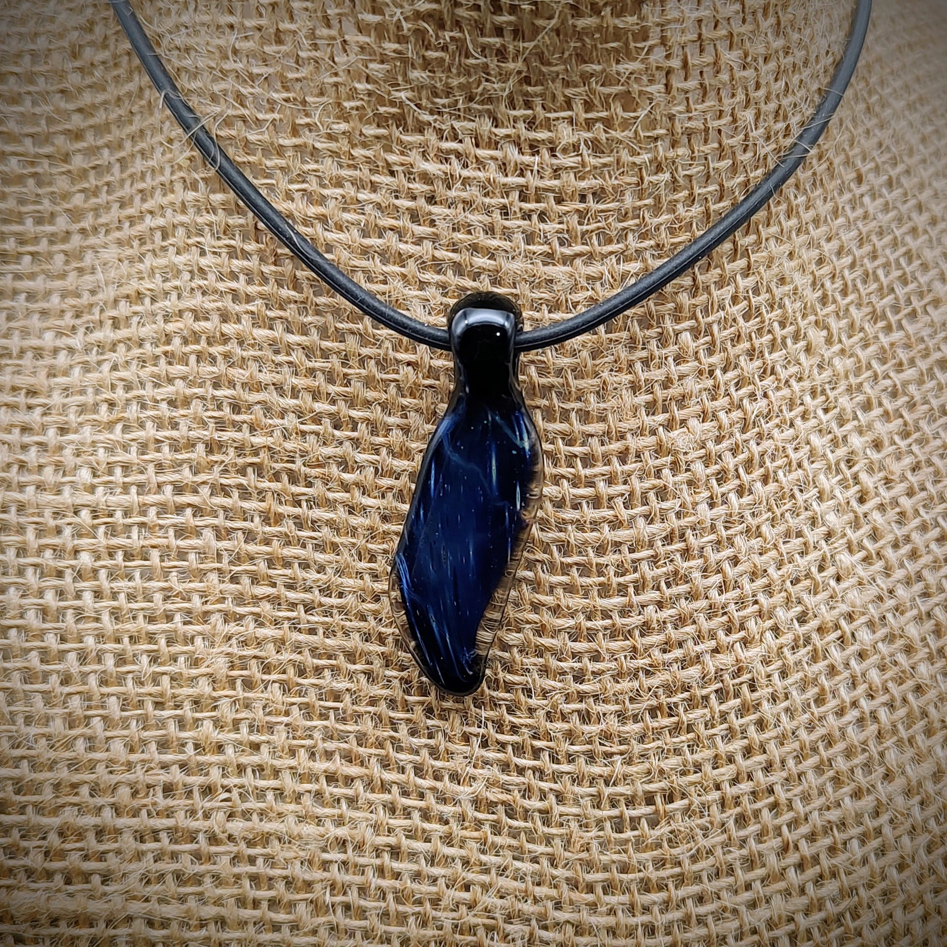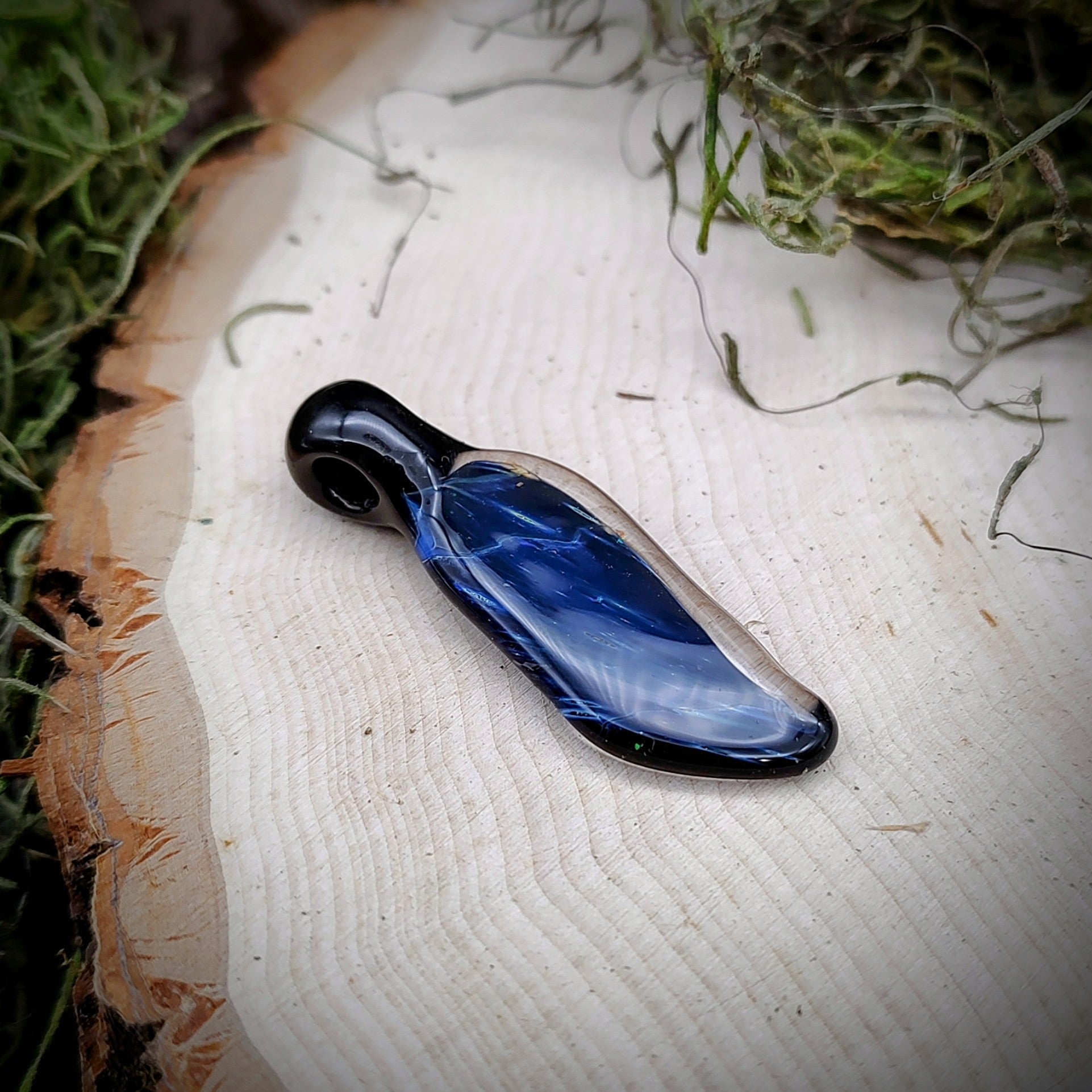 Este colgante Fumed Askew presenta un elegante respaldo negro con reflejos azules y un diseño ahumado único, creando una pieza verdaderamente llamativa. Listo para enviarse, este colgante seguramente llamará la atención.