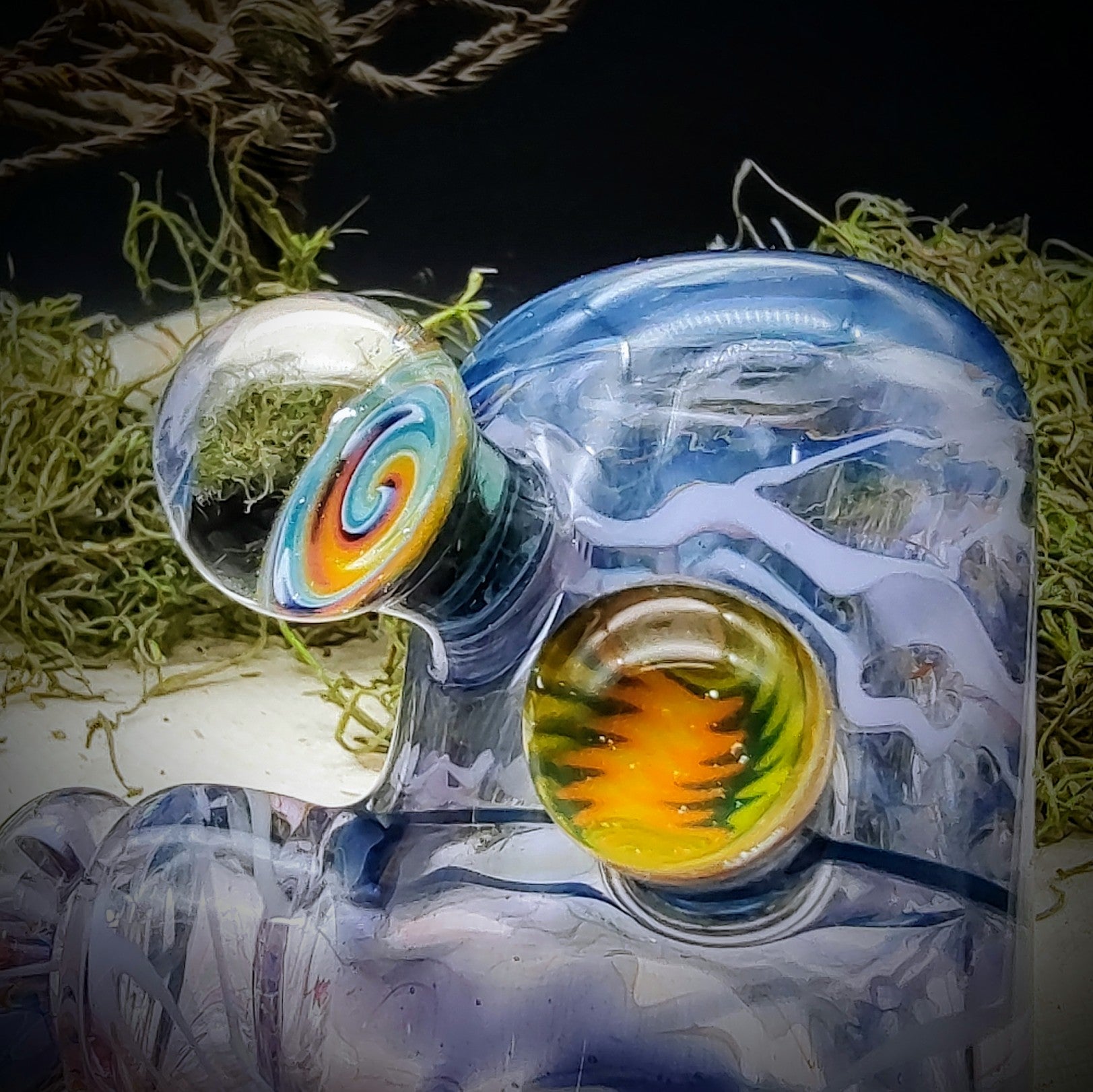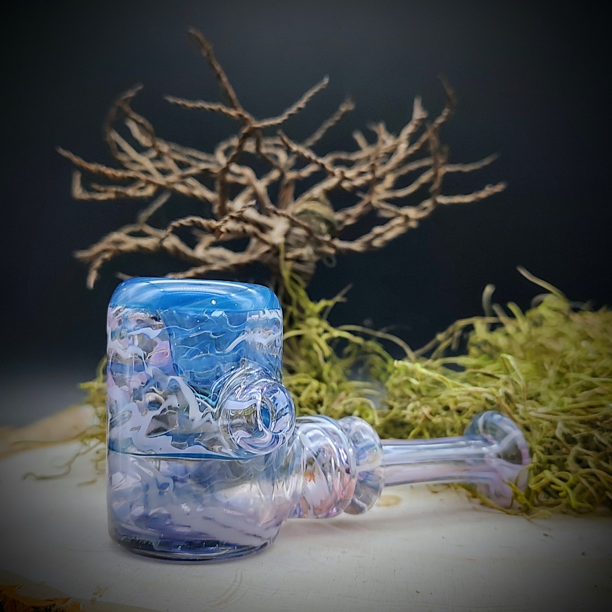 Esta pipa de mano con forma de martillo violeta/azul está confeccionada con un hermoso tubo transparente de mármol violeta, lo que la convierte en una adición impresionante a cualquier colección. Los intrincados detalles en mili añaden un toque de elegancia a esta pipa de mano lista para enviar.