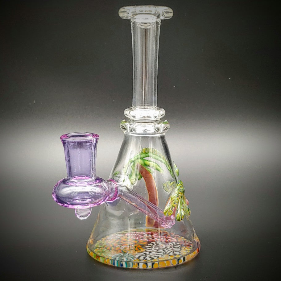 Un aparejo transparente en forma de vaso con un hermoso fondo marino acentuado con un vástago y un accesorio coloridos. Fondo de arrecife de coral con palmeras al costado